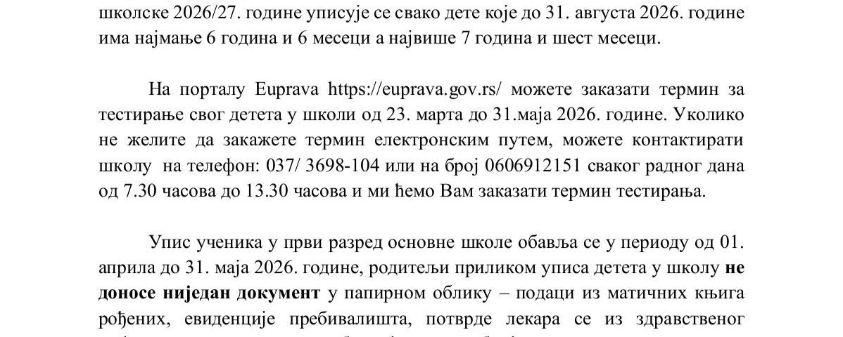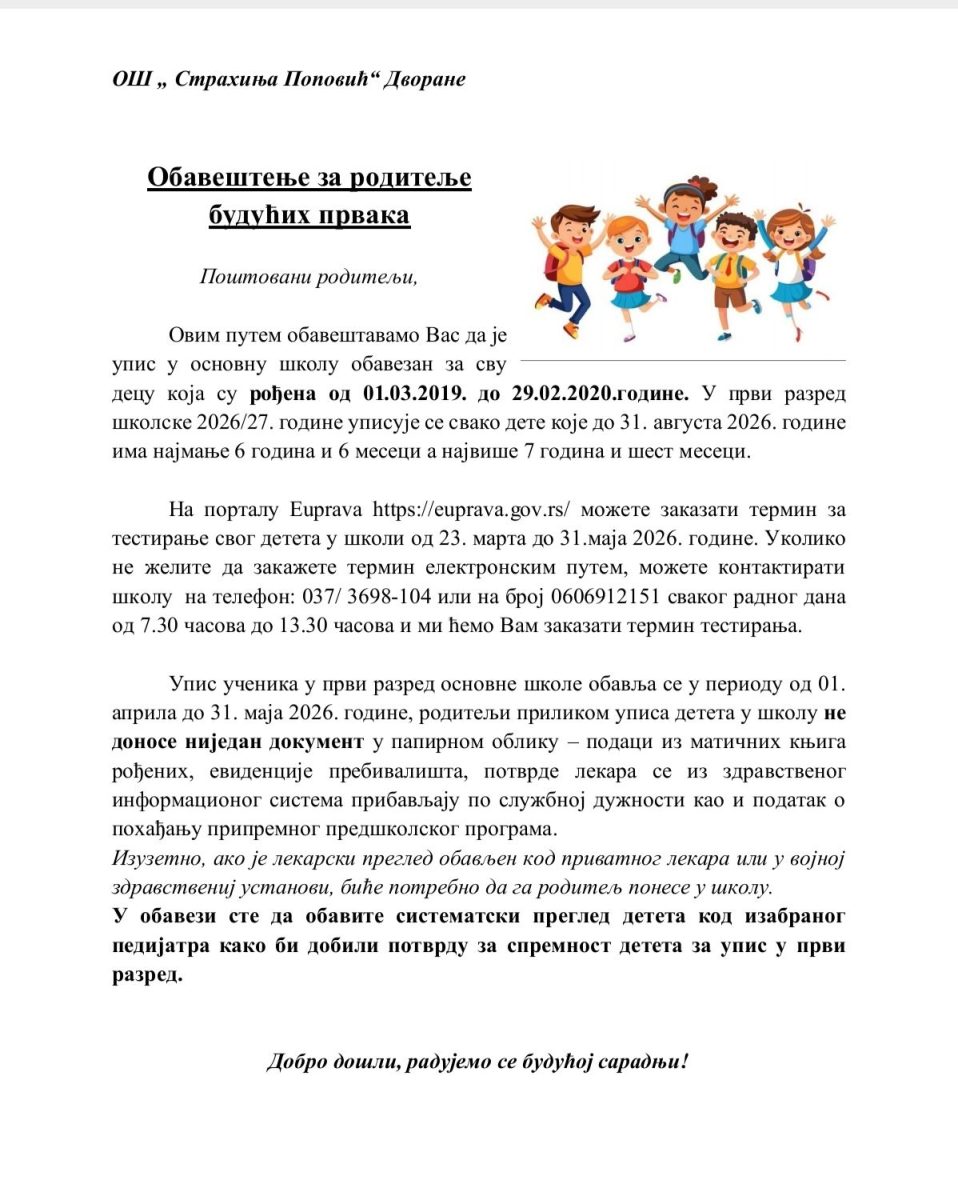 Обавештење за родитеље будућих првака